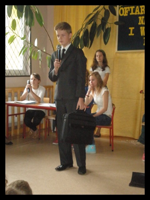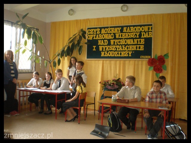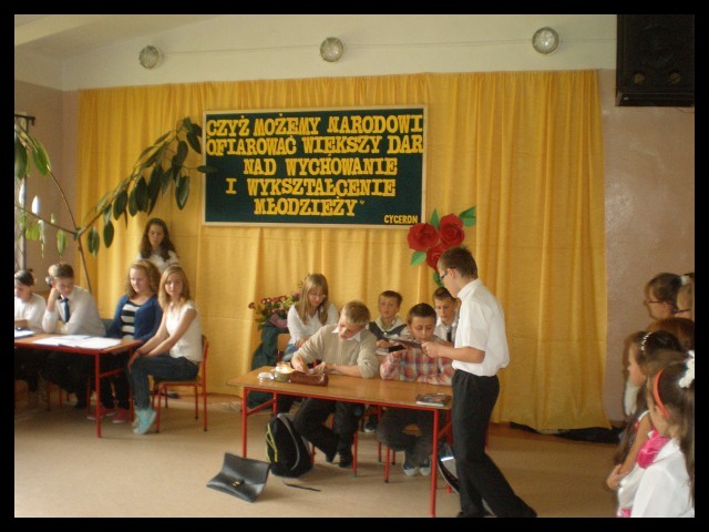 z okazji Dnia Edukacji Narodowej. Uczniowie klasy 3 szkoły podstawowej i klasy 1 gimnazjum pod kierunkiem wychowawców przygotowali humorystyczne przedstawienie, w którym ukazali ciężką pracę nauczycieli.