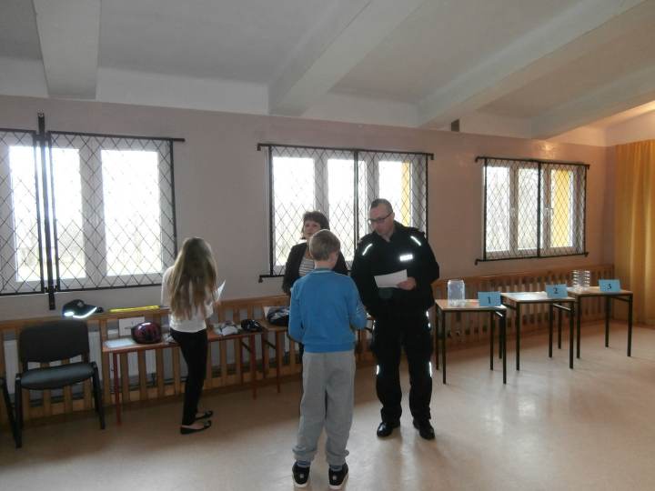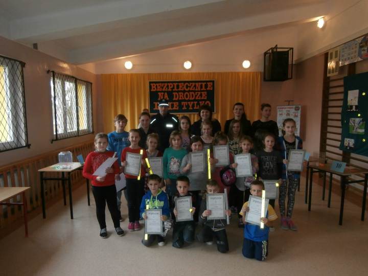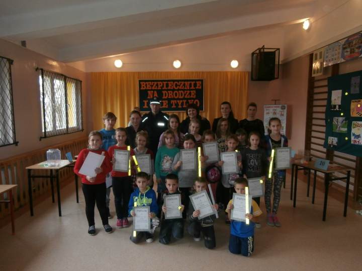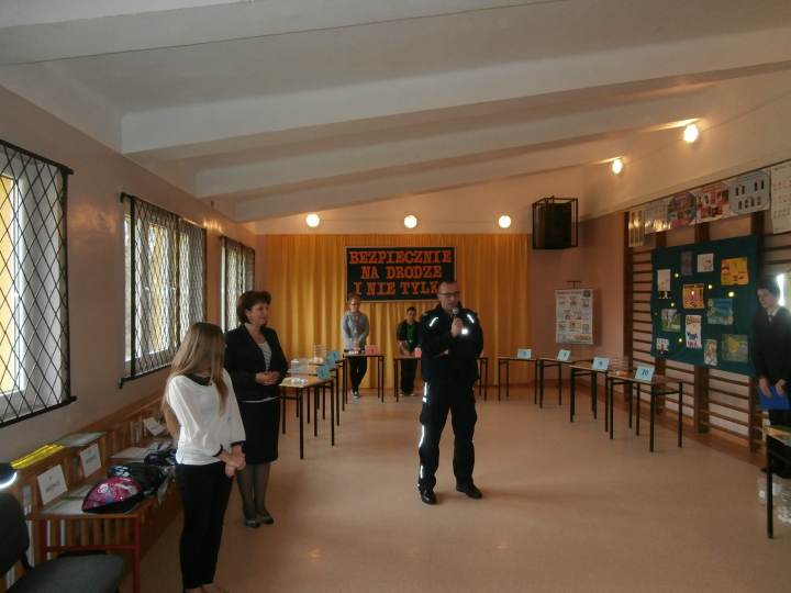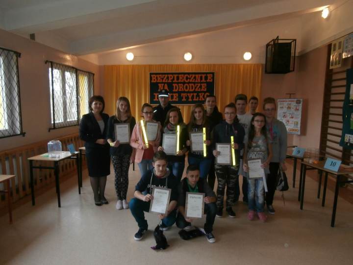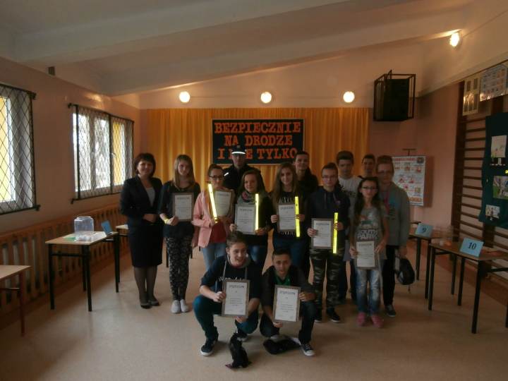 Klasy I –III i IV – VI wykonały prace plastyczne na temat „Jestem widoczny na drodze”, natomiast gimnazjalisci wzięli udział w konkursie wiedzy „Bezpiecznie na drodze i nie tylko”. Odbył sie on 1 grudnia 2014 r. Nad prawidłowym przebiegiem zmagań konkursowych czuwało jury w składzie: