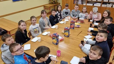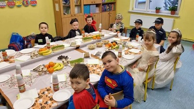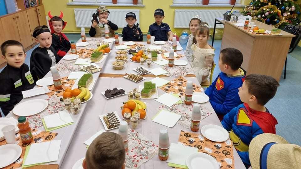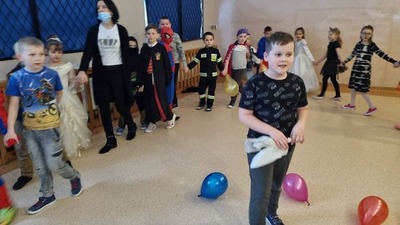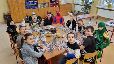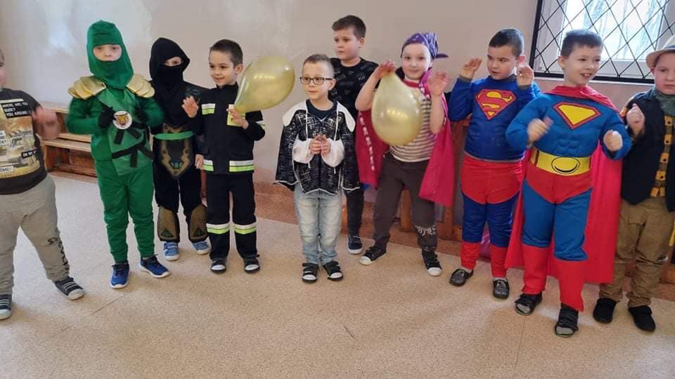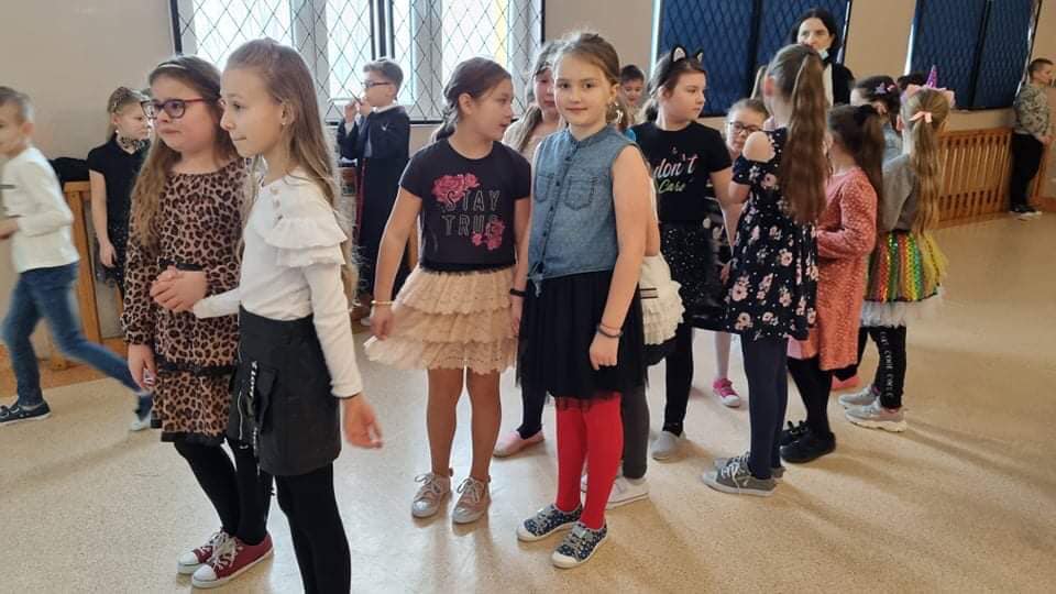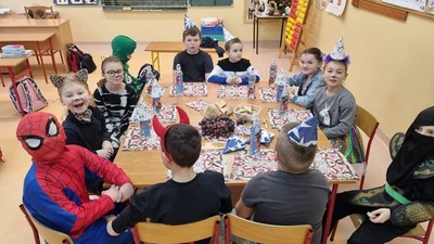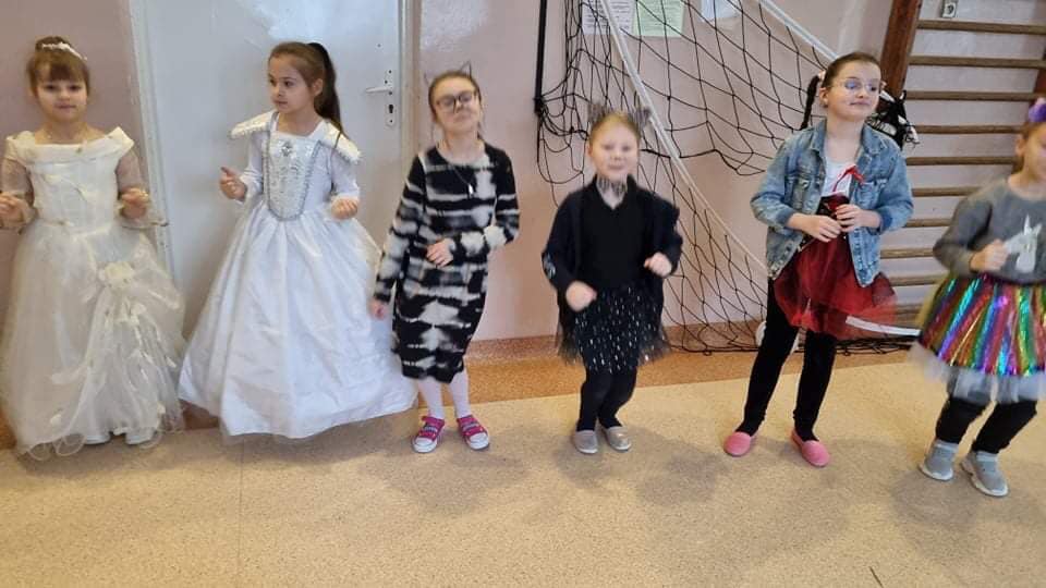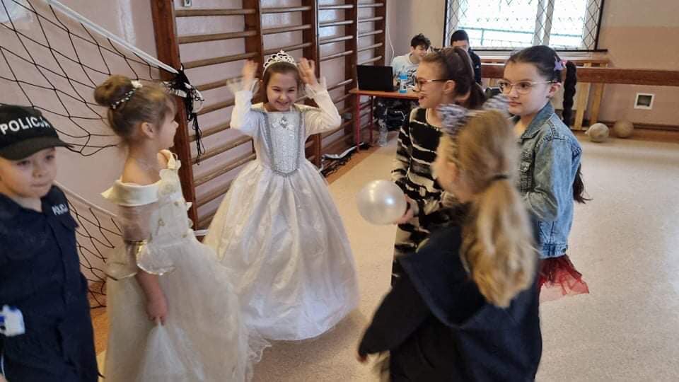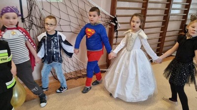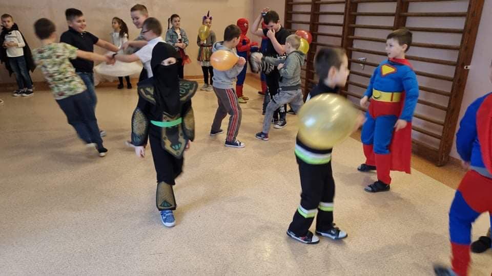 W dniu dzisiejszym odbyła się w naszej szkole zabawa karnawałowa uczniów klas I- III SP. Najmłodsi wychowankowie starannie przygotowali sie do balu. Byli: rycerze, kowboje, wojownicy Ninja, księżniczki, wróżki, myszki, policjanci, super herosi, np. Spiderman i Superman, a nawet Harry Potter i bohater filmu pt. "Dom z papieru". Dzieci świetnie bawiły się w rytmie ulubionych przebojów, które puszczali szkolni DJ-e: Kuba i Szymon z klasy VIII. Tradycyjnie były "kaczuszki" i "chusteczka". W czasie przerw posilano się smakołykami, przygotowanymi przez rodziców.