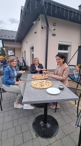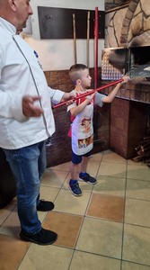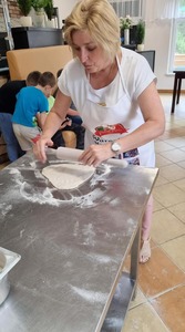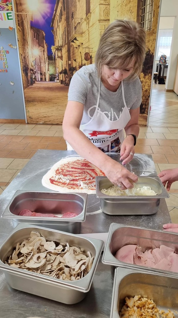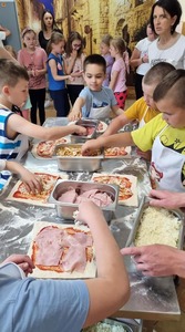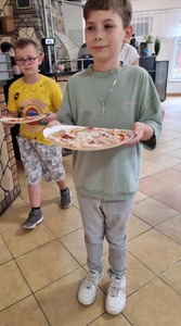 i poczęstunku, każdy z uczestników, nawet panie opiekunki, mógł przygotować własnoręcznie skomponowaną pizzę. Pod czujnym okiem pana Piotra uczestnicy warsztatów własnoręcznie wyrabiali ciasto, wybierali ulubione składniki: szynkę, kurczaka, salami, pieczarki, ser, paprykę, kukurydzę i inne, a następnie wkładali swój placek do pieca. Każdy wykonał pizzę, która zachwycała wyglądem, smakiem i aromatem.