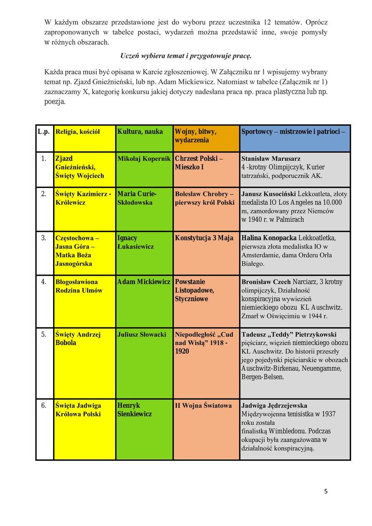 - Religia, Kościół ( do wyboru m.in. Zjazd Gnieźnieński, Święty Wojciech, Święta Faustyna Kowalska, Kardynał Stefan Wyszyński - Prymas Tysiąclecia, Papież Jan Paweł II, Biskup Antoni Baraniak, Ksiądz Jerzy Popiełuszko, Święta Jadwiga Królowa Polski).