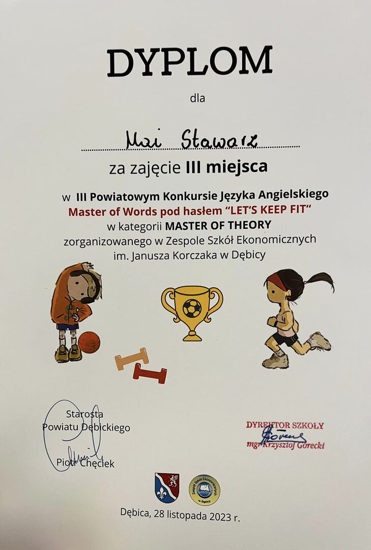 w Powiatowym Konkursie Języka Angielskiego „Master of Words”, który odbył się 28 listopada 2023 r.