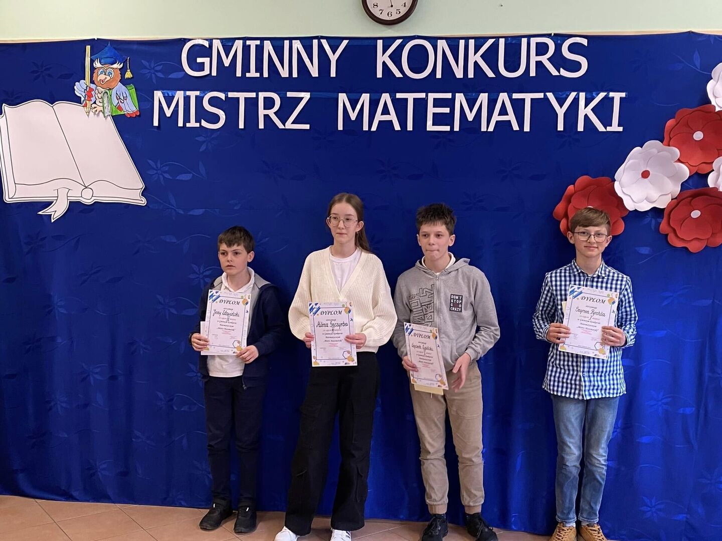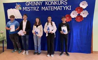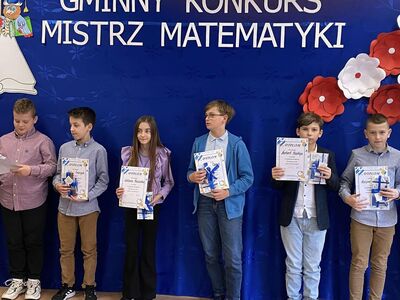 W piątek 26 kwietnia pod opieką pani Bożeny Longosz-Wolańskiej troje uczniów Norbert Madeja z klasy V, Jerzy Litawińskj z klasy VI oraz Igor Lechowski z klasy VIII wzięło udział w Gminnym Konkursie Matematycznym „Mistrz Matematyki” organizowanym przez Publiczną Szkołę Podstawową w Pilźnie im. Władysława Jagiełły. Uczniowie przez 60 minut rozwiązywali test składający się z 10 zadań zamkniętych i 4 otwartych. Jerzy Litawiński w kategorii klasa 6 zajął II miejsce pokonując uczniów z siedmiu szkół.