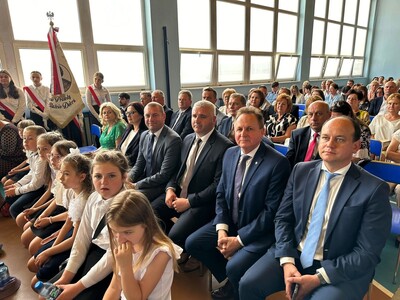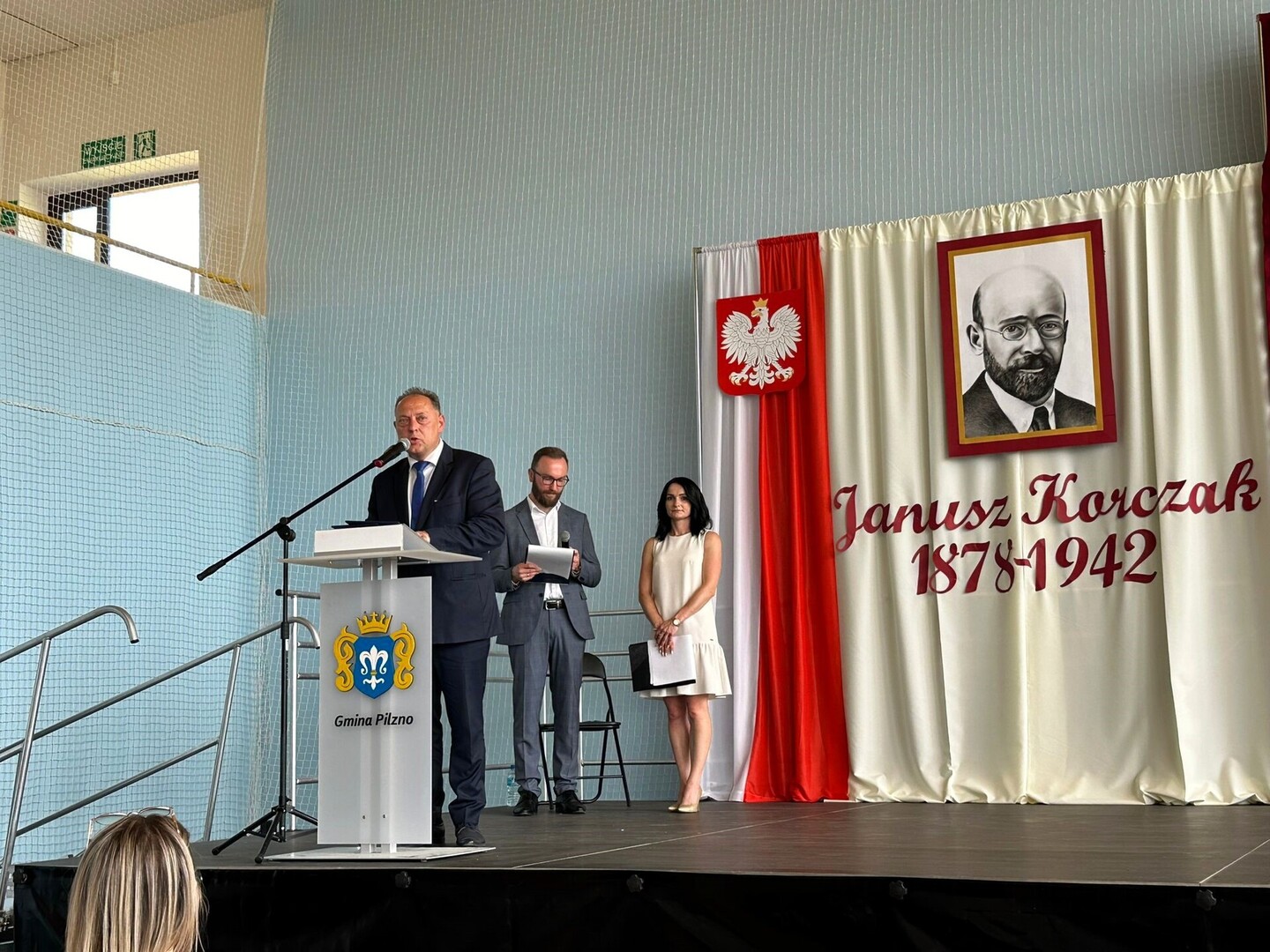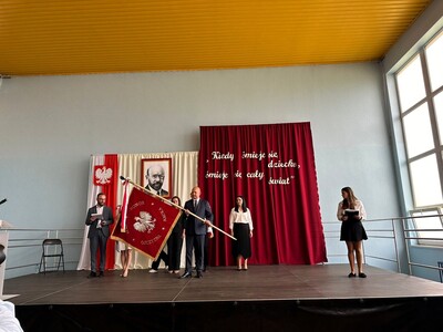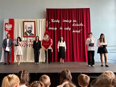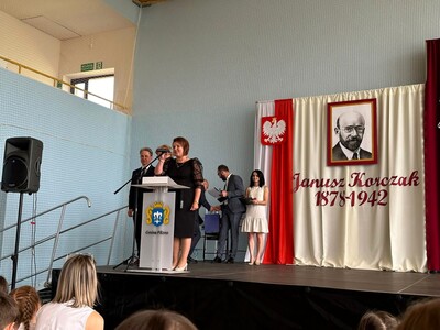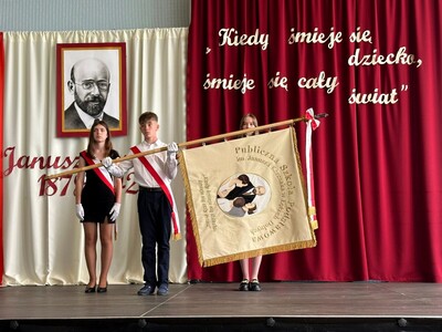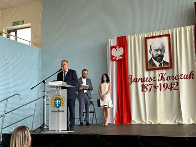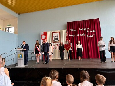 W dniu dzisiejszym pani dyrektor Aurelia Mącior oraz poczet sztandarowy w składzie: Konrad Kita- chorąży oraz Natalia Kozioł i Martyna Gęza- asysta wraz z opiekunem p. Edytą Potok uczestniczyli w uroczystościach związanych z nadaniem imienia szkole podstawowej w Łękach Dolnych. Od dziś patronem szkoły będzie Janusz Korczak.