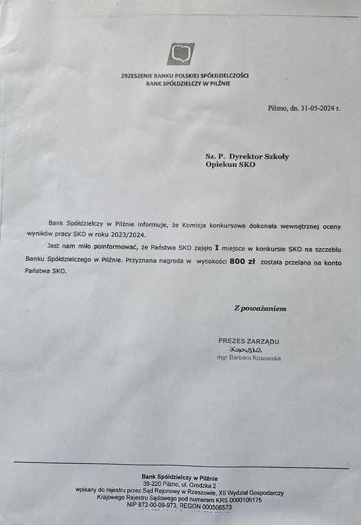 SKO działające w naszej szkole w roku szkolnym 2023/2024 kolejny raz zajęło I miejsce w konkursie SKO na szczeblu Banku Spółdzielczego w Pilźnie.