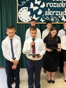 Nasi absolwenci przeszli długą drogę – od nieśmiałych pierwszoklasistów do dojrzałych, odpowiedzialnych nastolatków gotowych, by iść dalej. We wzruszających słowach podziękowali Pani Dyrektor, wychowawcom, nauczycielom, pracownikom szkoły ora rodzicom za trud włożony w ich wychowanie i edukację.