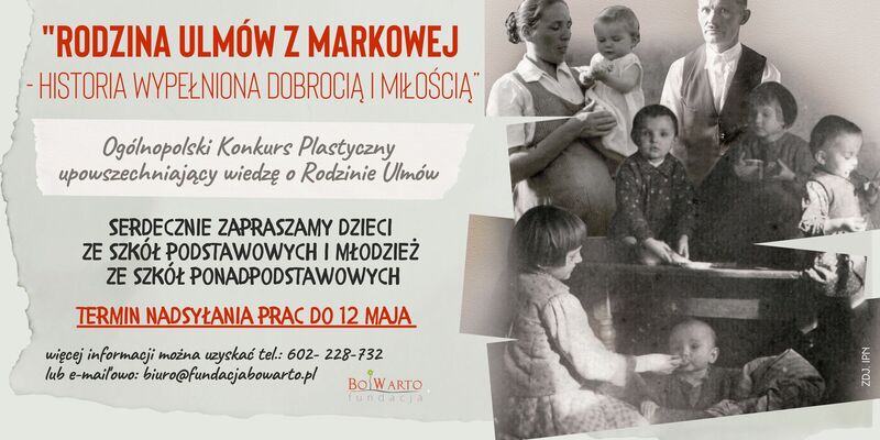 17.04.2023 Aktualności KONKURS PLASTYCZNY Serdecznie zapraszamy uczniów naszej szkoły do udziału w Ogólnopolskim Konkursie Plastycznym „RODZINA ULMÓW z MARKOWEJ – historia wypełniona dobrocią i Miłością”, który... Czytaj więcej